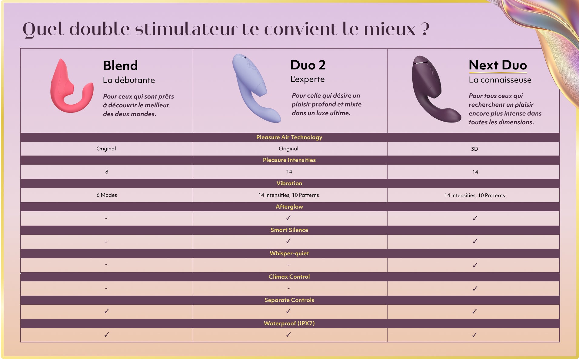 Contrôles de moteur séparésContrôlez l’air pulsé et les vibrations ensemble ou séparément pour une personnalisation maximale.