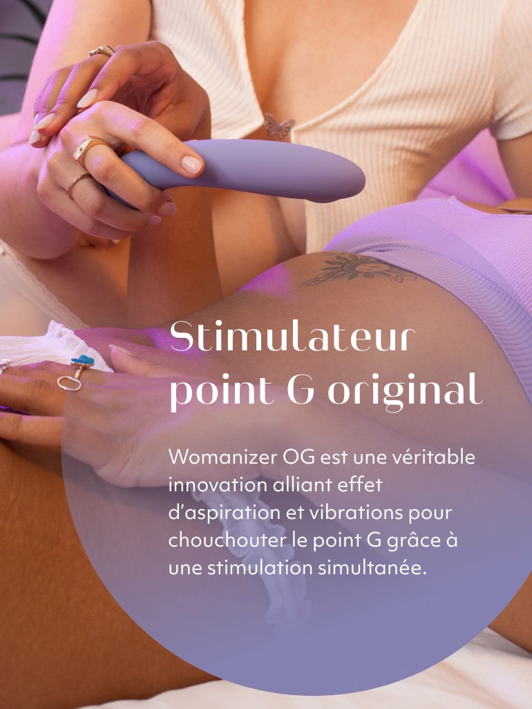 Le plaisir avant toutLe design intelligent de ce sextoy permet d’orienter parfaitement les vibrations ainsi que la Pleasure Air Technology au niveau de votre point G. Incurvé pour épouser l’anatomie, Womanizer OG s’ajuste facilement grâce à son bras flexible.