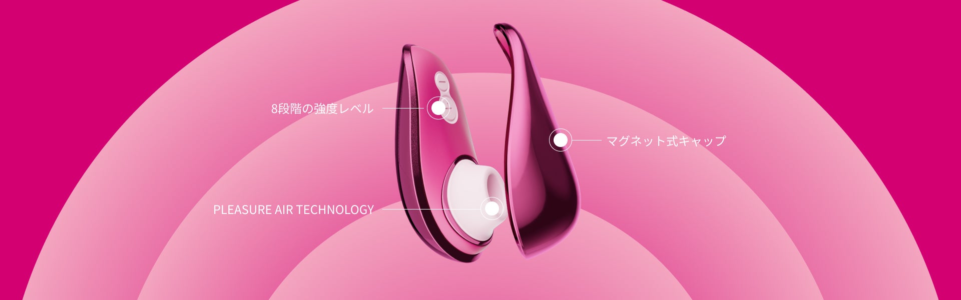 Pleasure Air Technology体に優しい設計 : すべての Womanizer 製品には Pleasure Air Technology という独自技術が搭載されています。このテクノロジーが特別な理由は、クリトリスに直接触れることなく刺激を与えてくれるためです。優しい空気の振動が吸引と同時にマッサージを行い、かつてないオーガズムの感覚をもたらします。