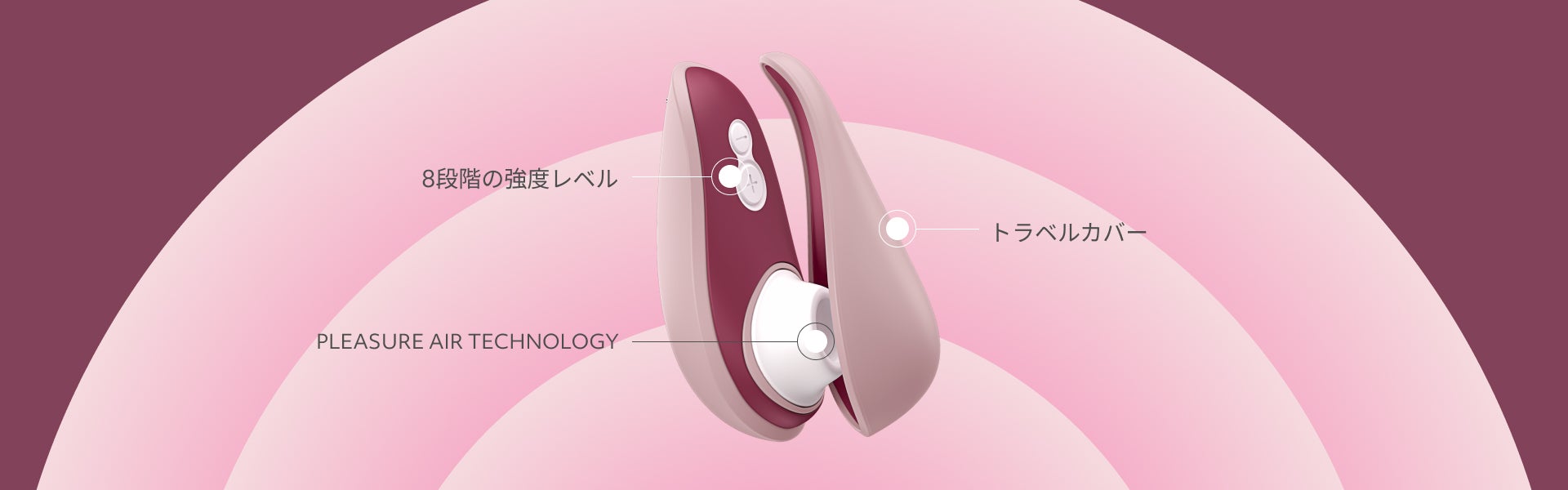 体に優しい設計 : すべての Womanizer 製品には Pleasure Air Technology という独自技術が搭載されています。このテクノロジーが特別な理由は、クリトリスに直接触れることなく刺激を与えてくれるためです。優しい空気の振動が吸引と同時にマッサージを行い、かつてないオーガズムの感覚をもたらします。